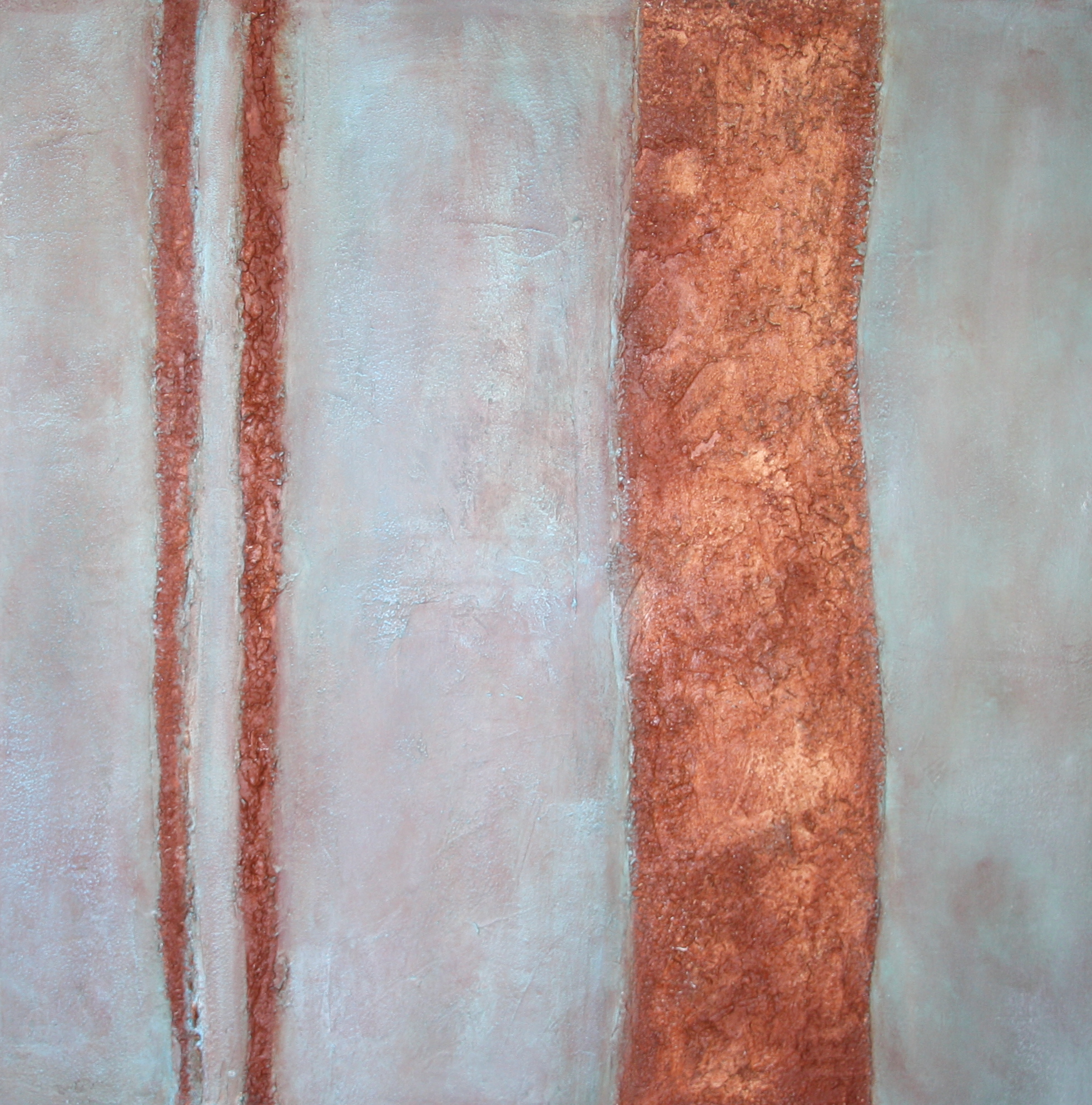 Blauw en roestbruin zijn de belangrijkste kleuren in dit schilderij. De textuur loopt in banden over dit werk.