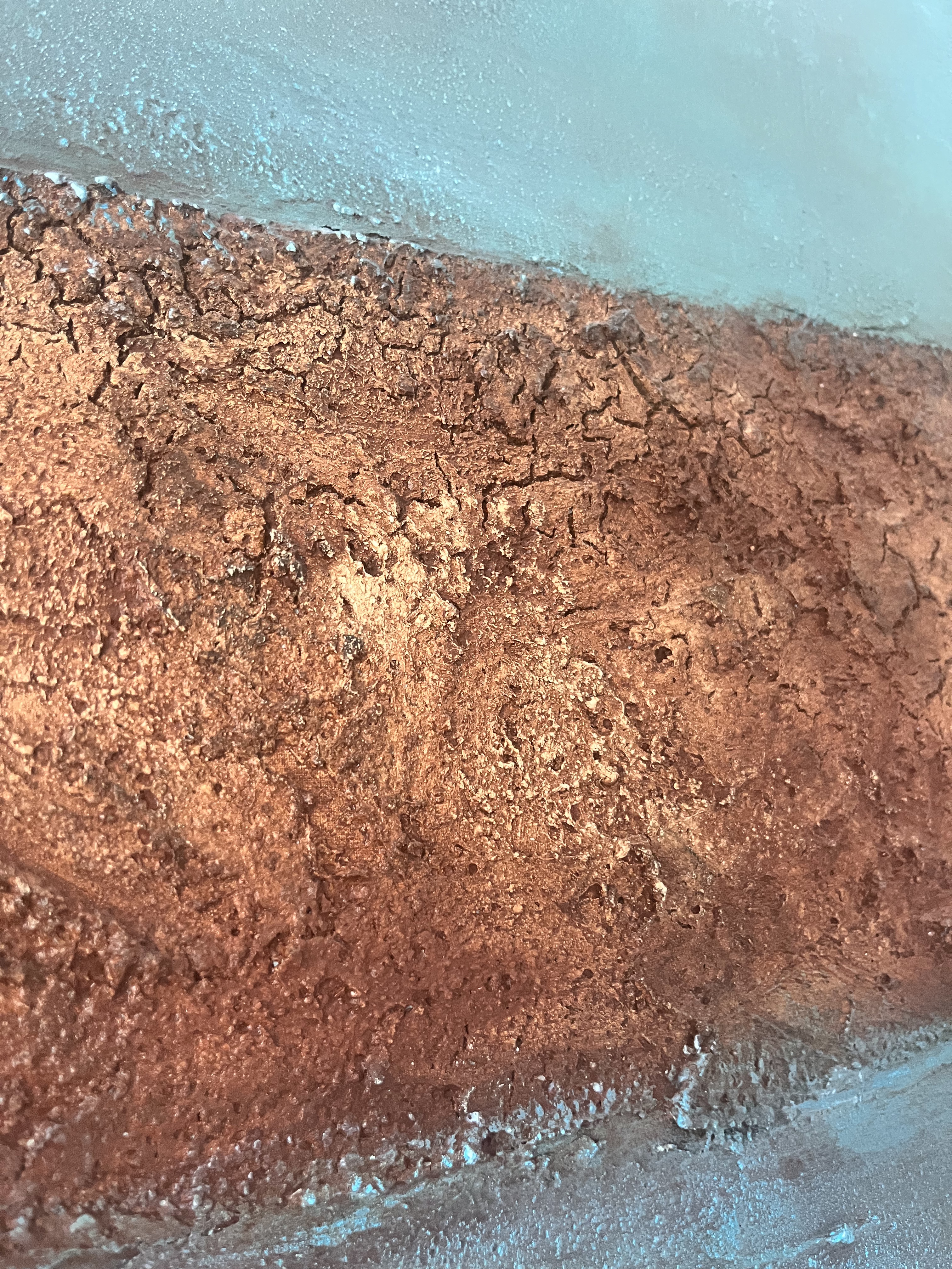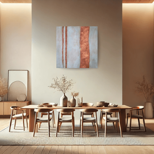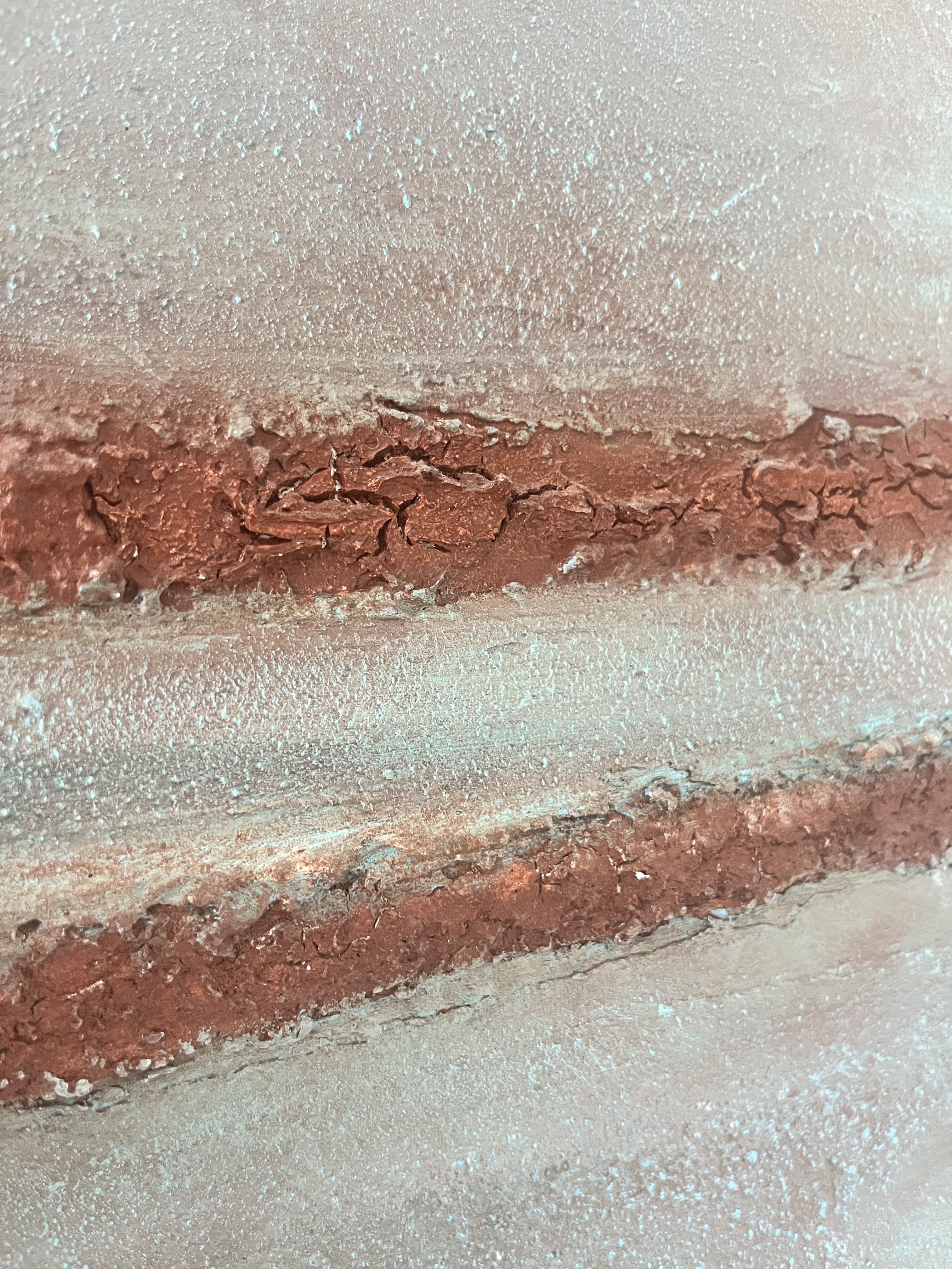 Soms is de grootste kracht te vinden in het onvolmaakte. Dit schilderij belichaamt dat idee. De warme, aardse tinten en verticale lijnen lijken een breuk te tonen, maar ook de kracht die erin schuilt – een balans tussen kwetsbaarheid en stabiliteit. Het werk vertelt een verhaal over groei en veerkracht, over hoe iets gebroken niet minder waardevol is, maar juist meer diepte kan krijgen.