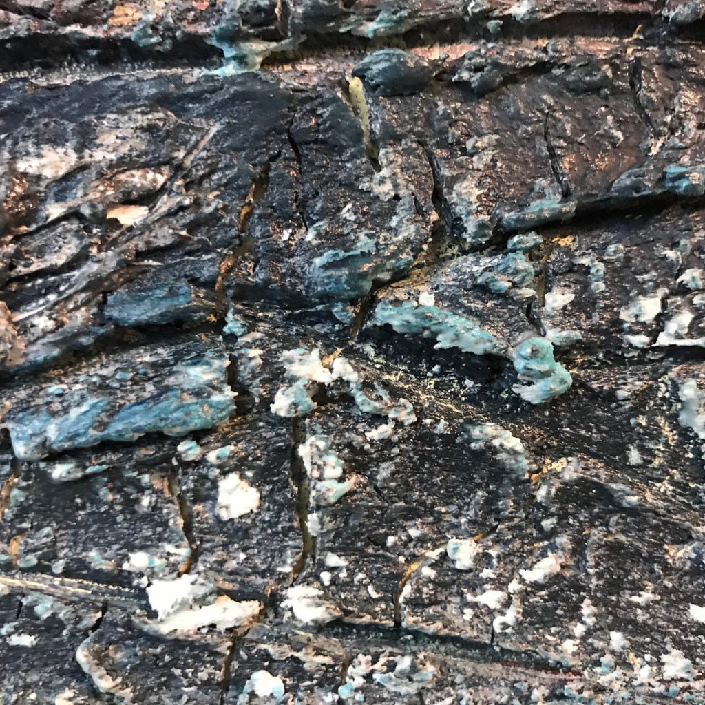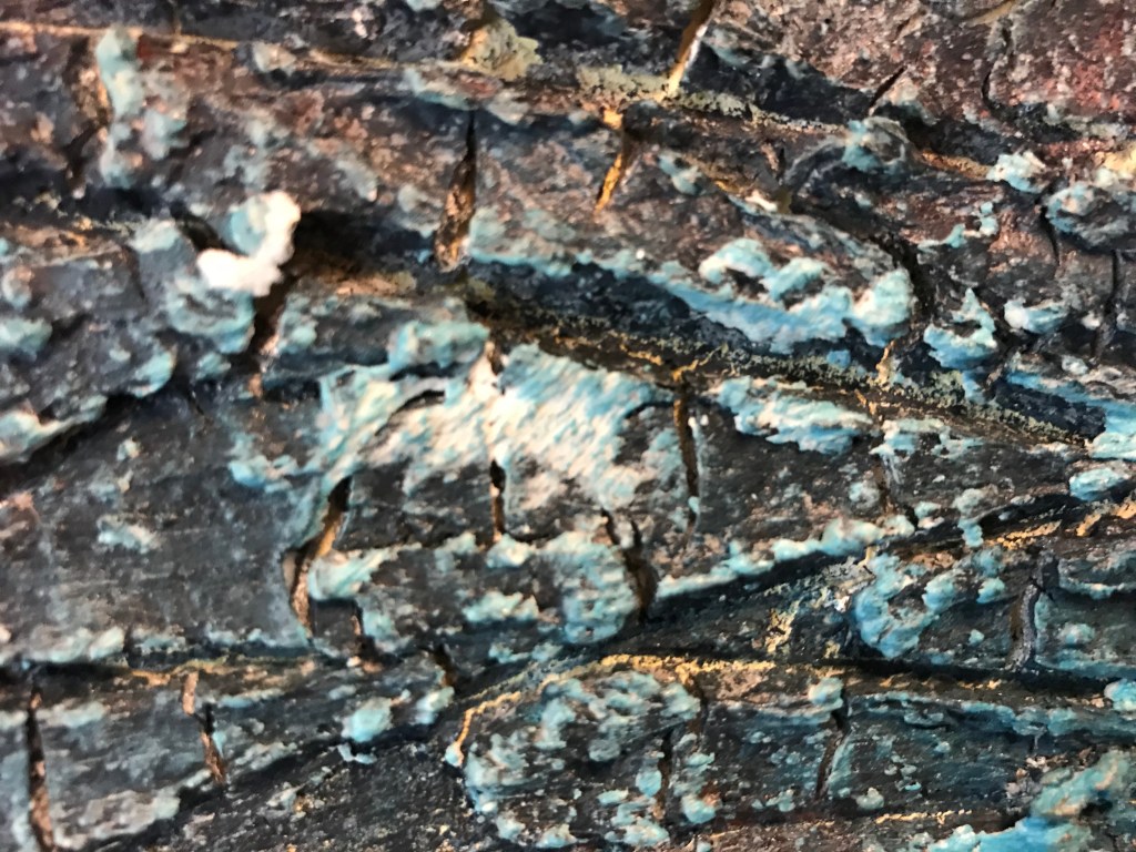 Abstract schilderij met textuur: cirkel in blauw met bruin.