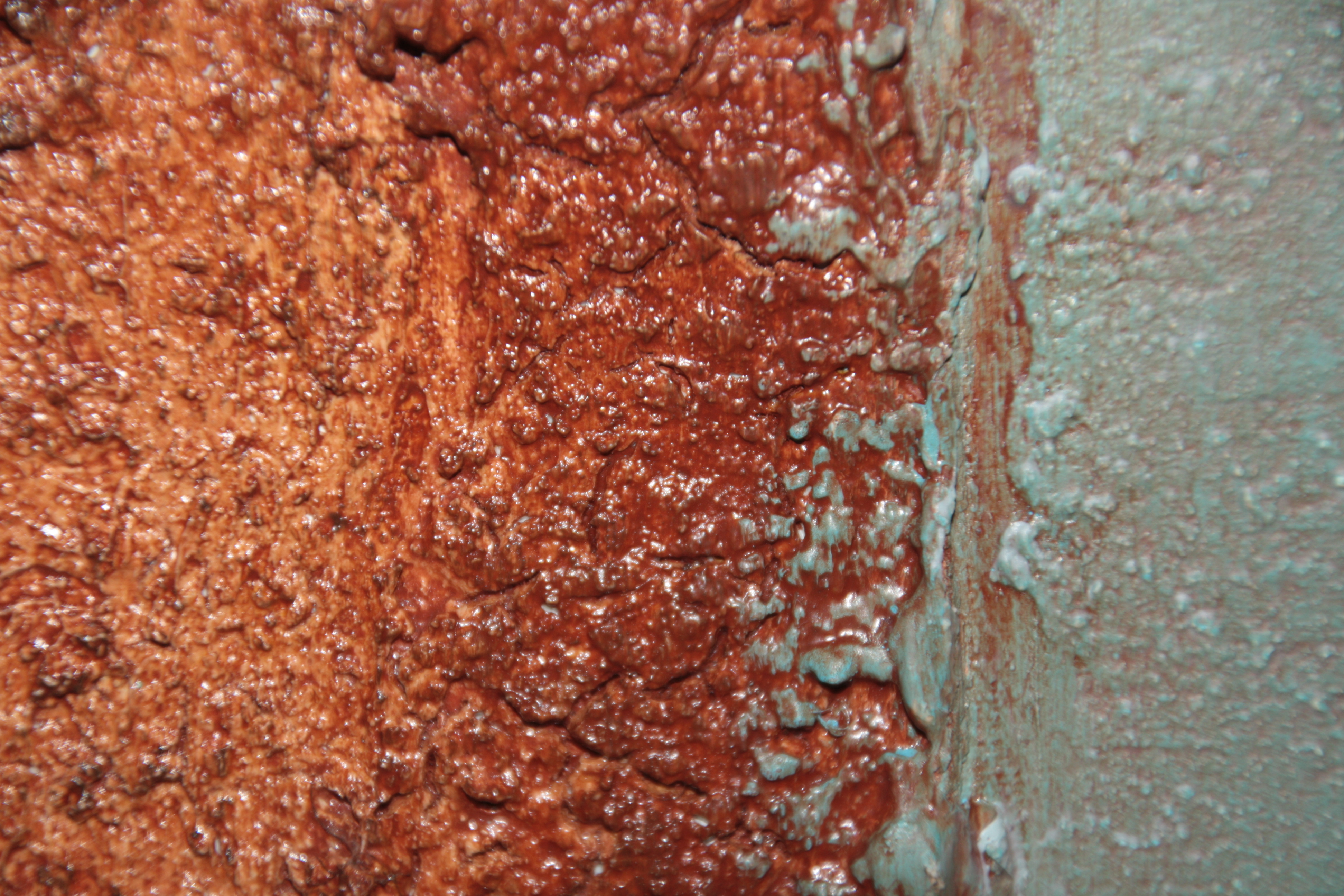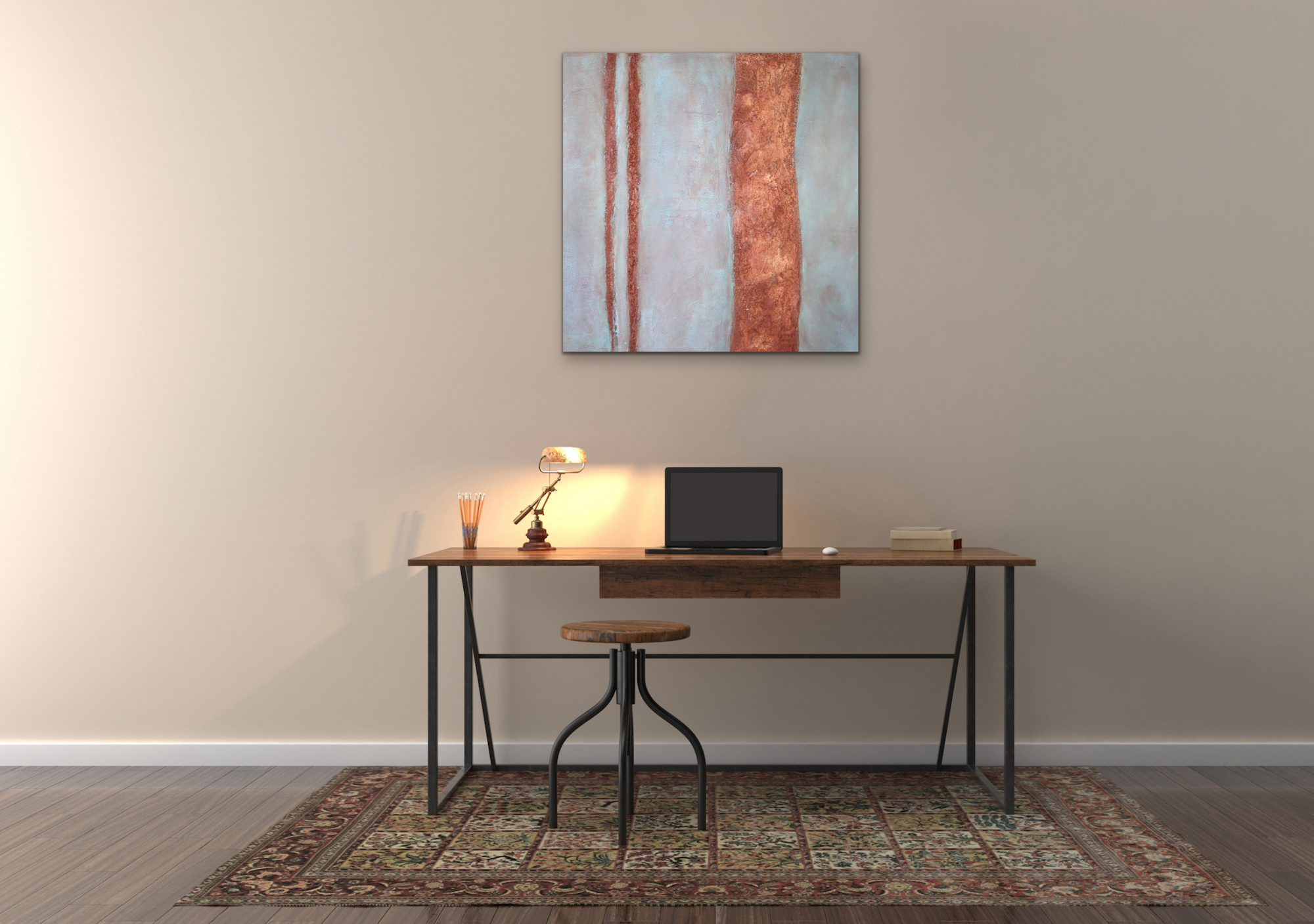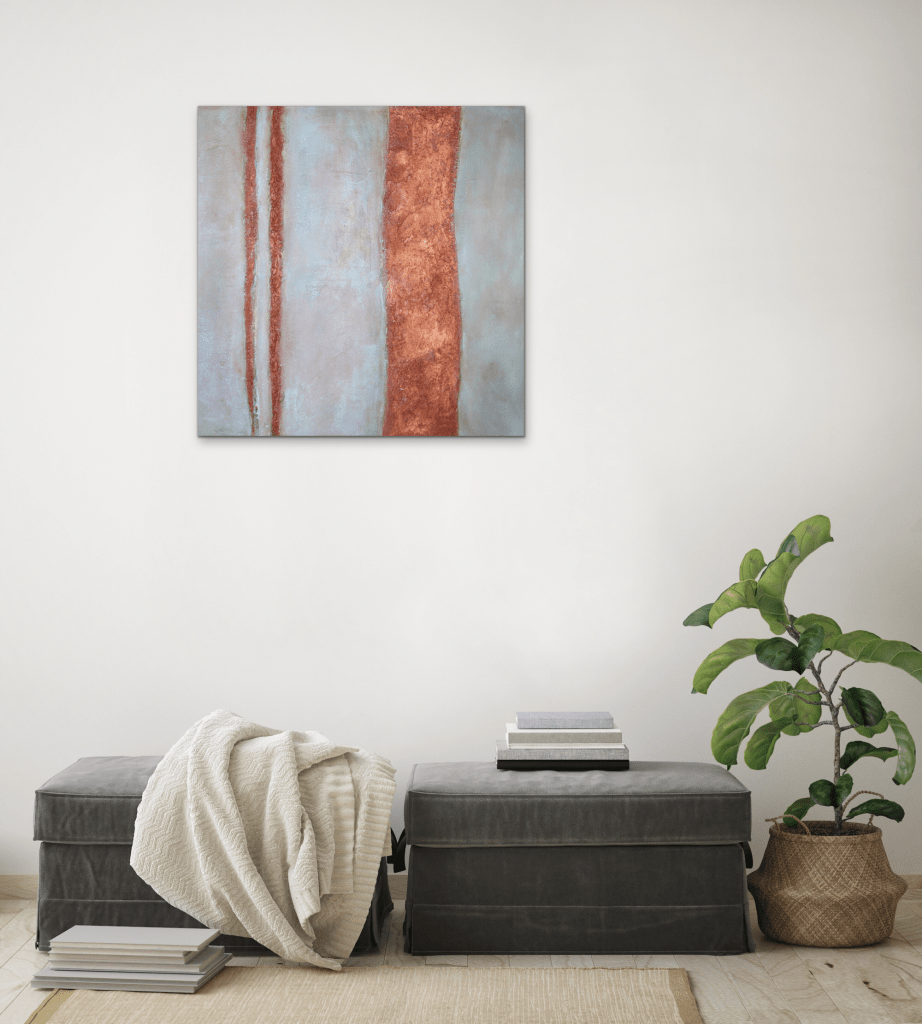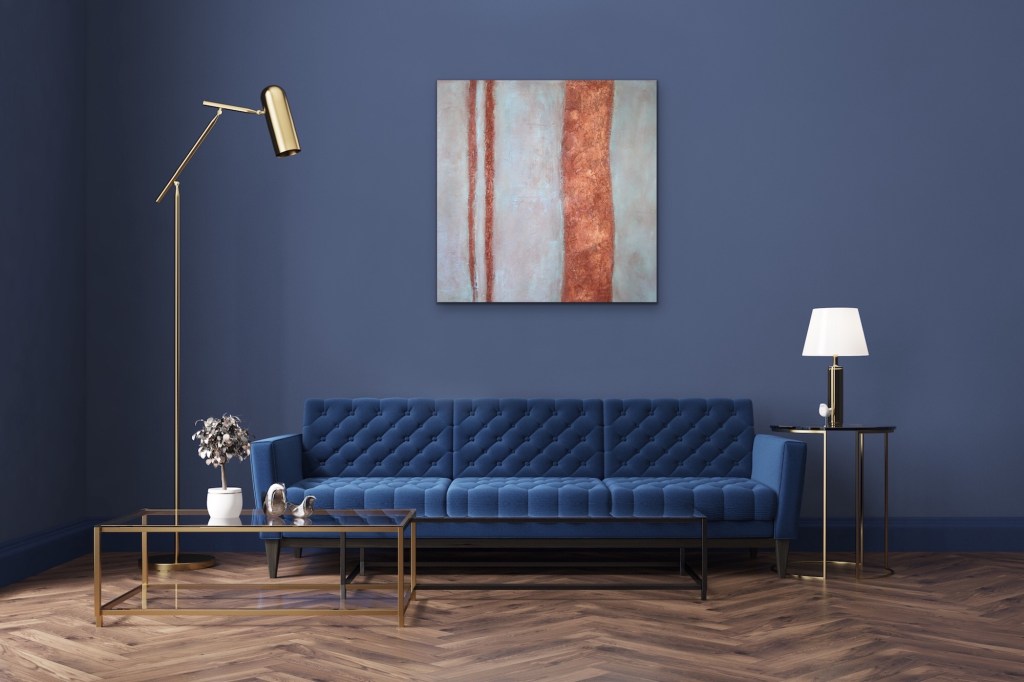 - Handmade abstract painting with texture in blue and rust brown.