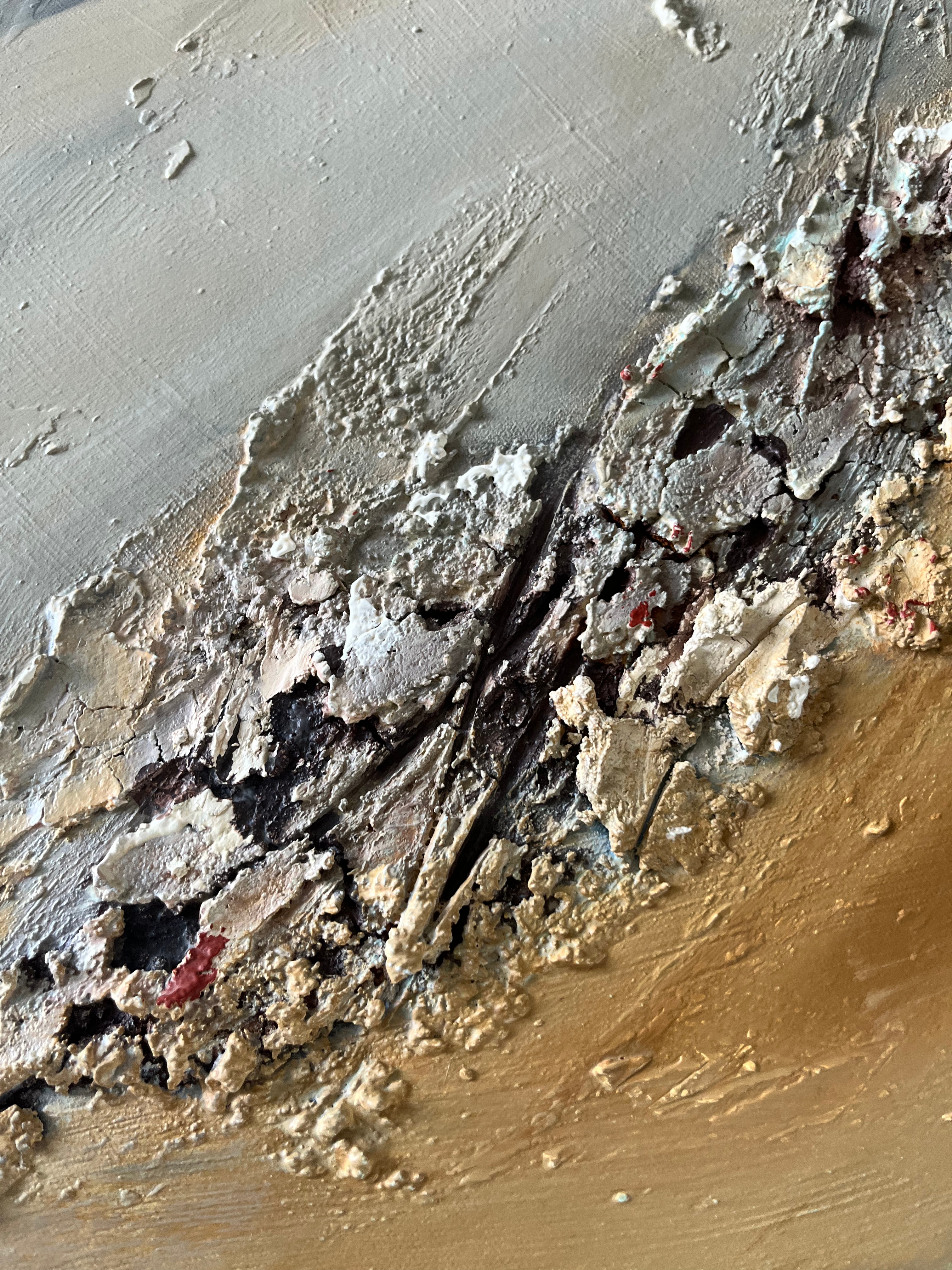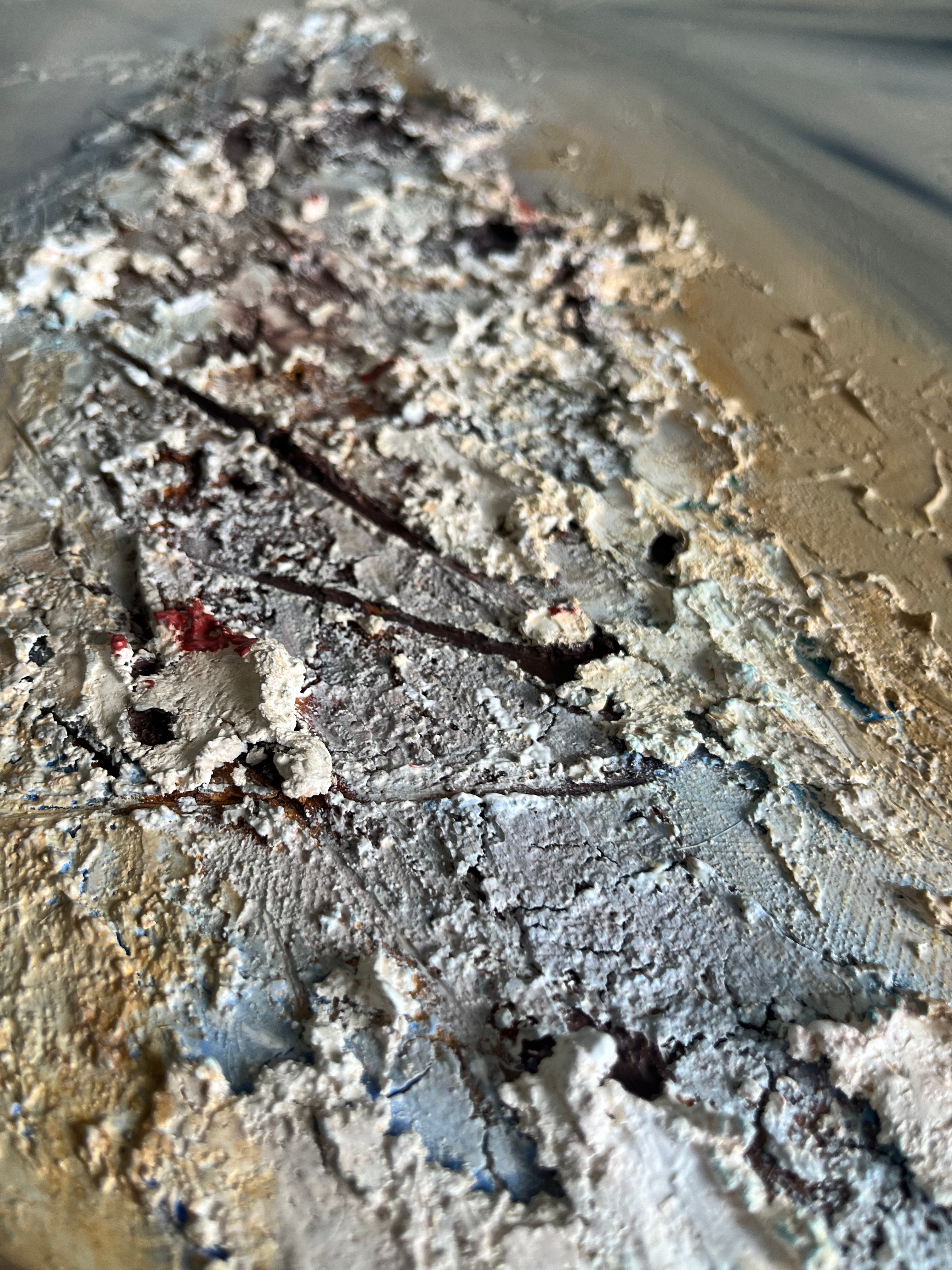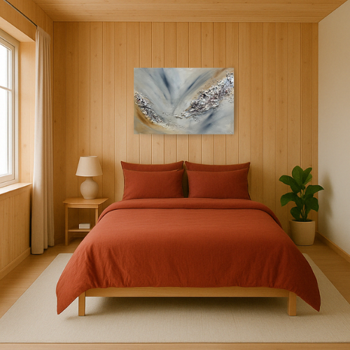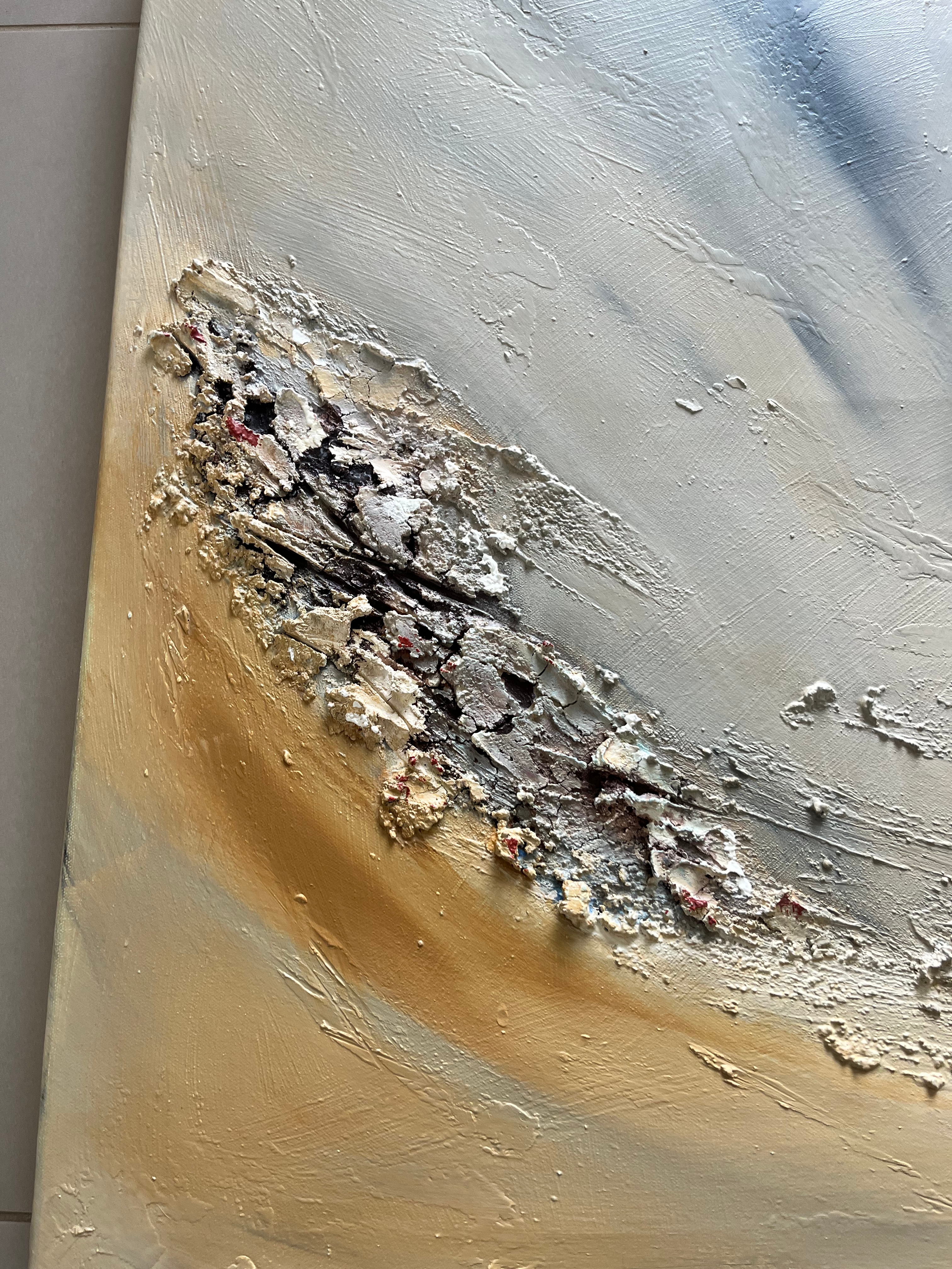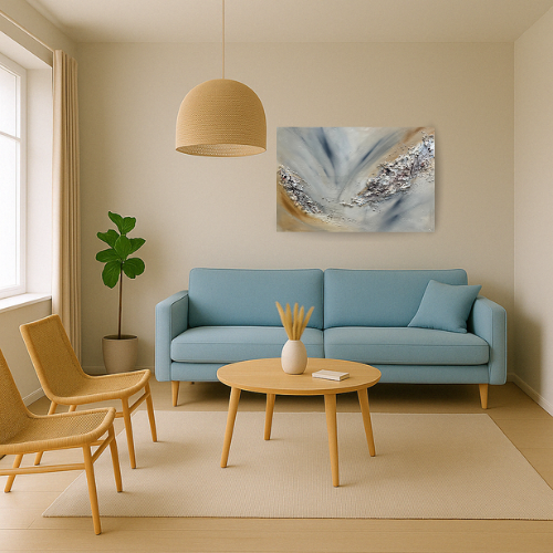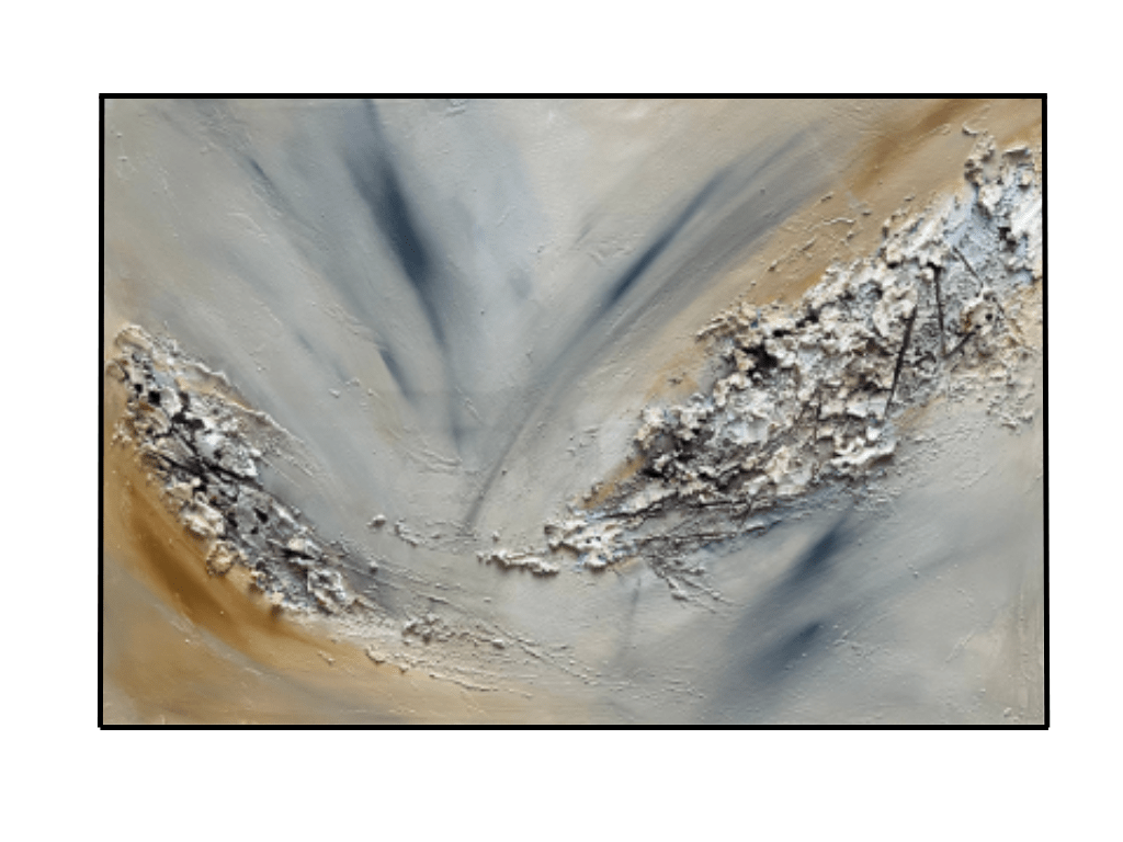 In de hectiek van het leven zijn het vaak de kleine momenten van stilte die ons de meeste kracht geven. Dit schilderij vangt precies die subtiele, maar krachtige rust die we tussen de regels door ervaren. De zachte tinten en vloeiende lijnen creëren een gevoel van kalmte, alsof het kunstwerk zelf een adem haalt en zich aanpast aan de ruimte waarin het hangt. Het herinnert ons eraan dat rust niet altijd luid en opvallend hoeft te zijn, maar juist vaak te vinden is in de stilte, in de ruimtes tussen de grote gebaren en woorden.