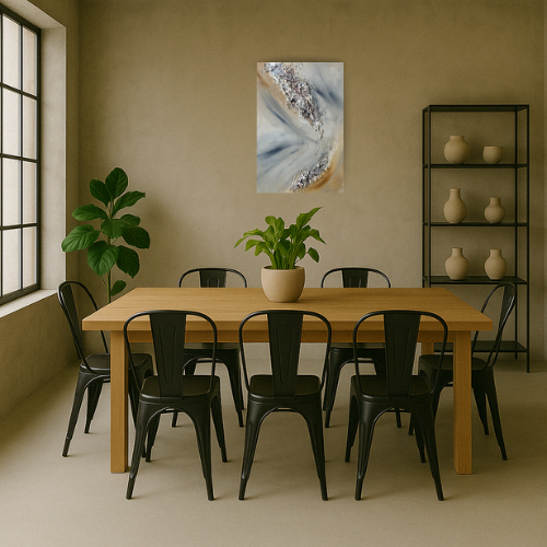 Dit kunstwerk is perfect voor wie op zoek is naar balans in zijn omgeving – een balans tussen energie en rust, tussen beweging en stilte. Het zal niet alleen je ruimte vullen, maar ook je geest. De subtiele kleuren en vormen brengen een gevoel van sereniteit, waardoor dit schilderij de ideale toevoeging is aan een werkkamer, woonkamer of een plek waar je reflectie en rust zoekt.